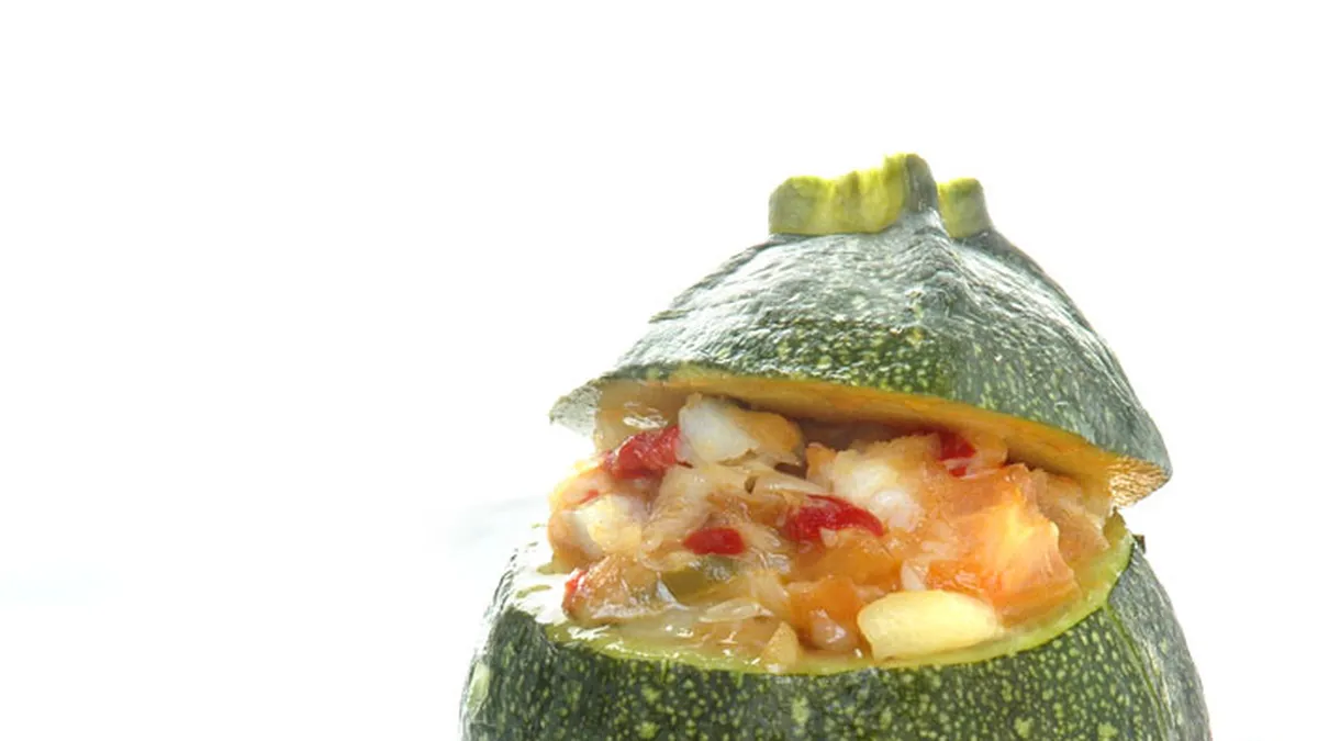 Receta de calabacín relleno de bacalao desmigado, pimientos y tomates. Receta de calabacines de Karlos Arguiñano.