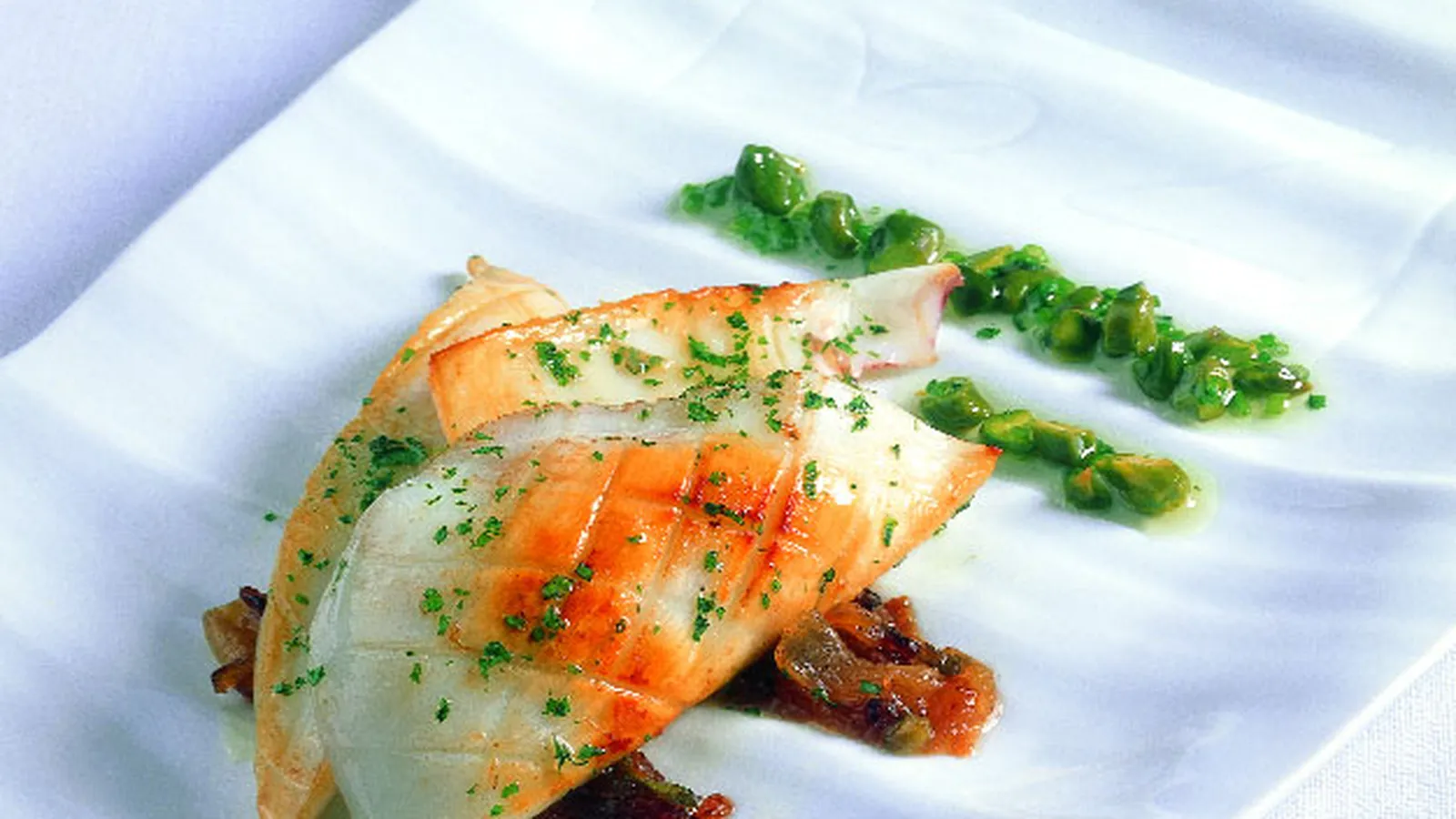 Calamar grande a la plancha y encebollado con vinagreta de cebollino y pistachos