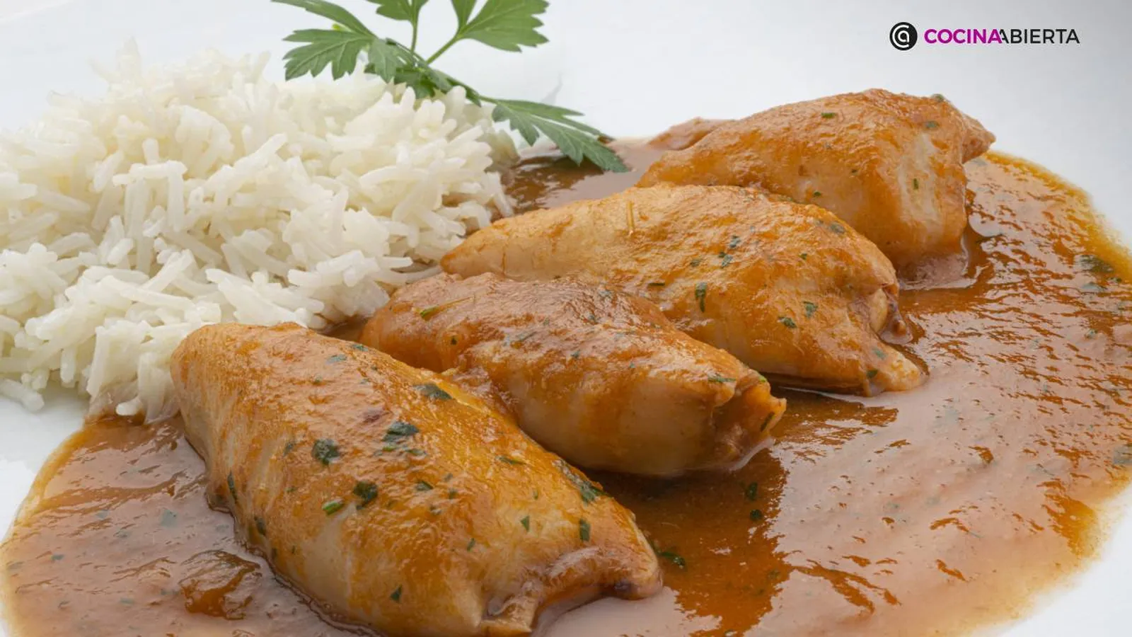 Sirve 4 calamares rellenos con salsa americana en cada plato, salsea y acompáñalos con un poco de arroz blanco. Decora los platos con unas hojas de perejil.
