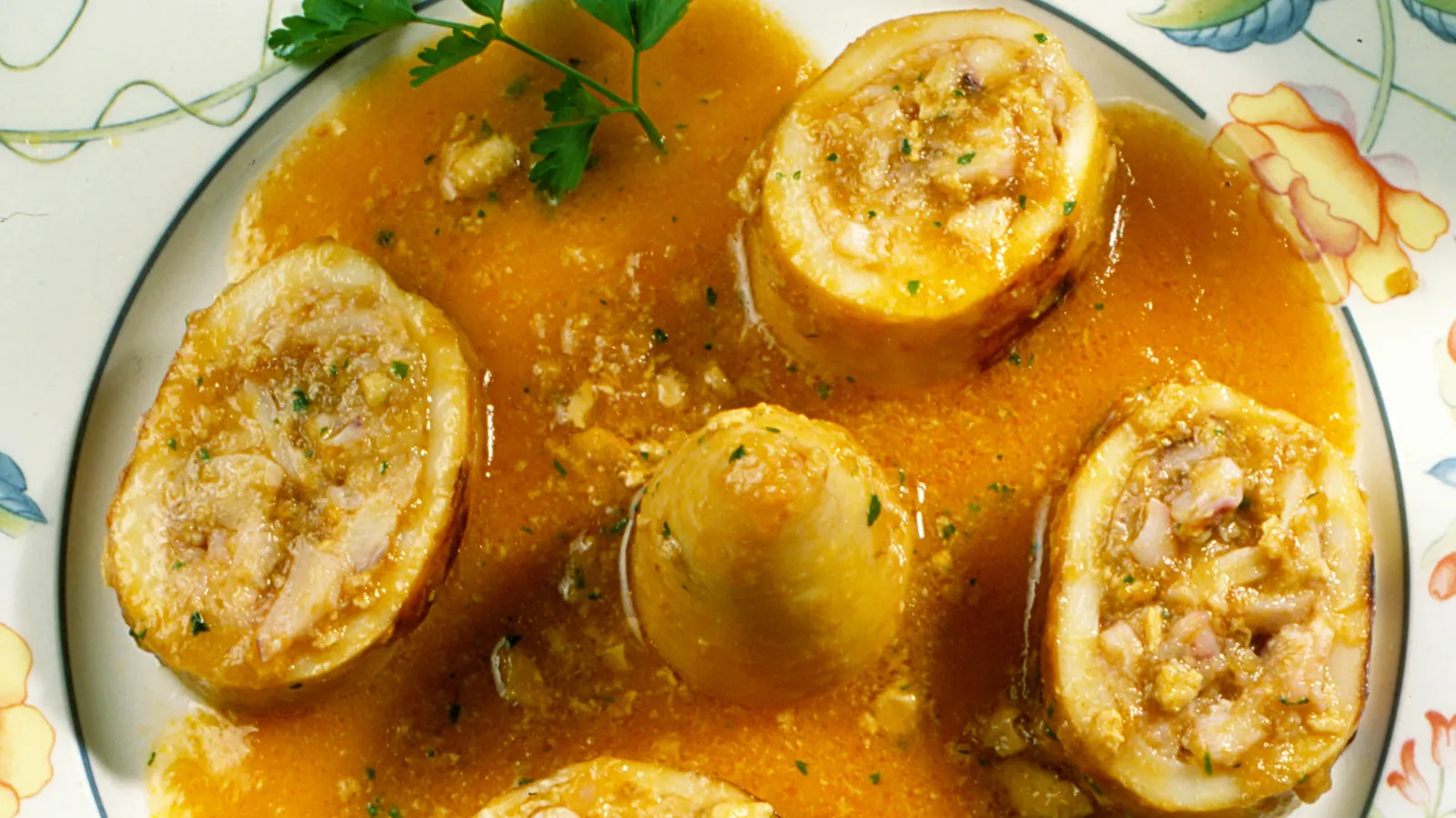 Rellena con esta mezcla los calamares y colócalos salpimentados, en una fuente resistente al horno. Riégalos con la salsa de tomate y el vino blanco.