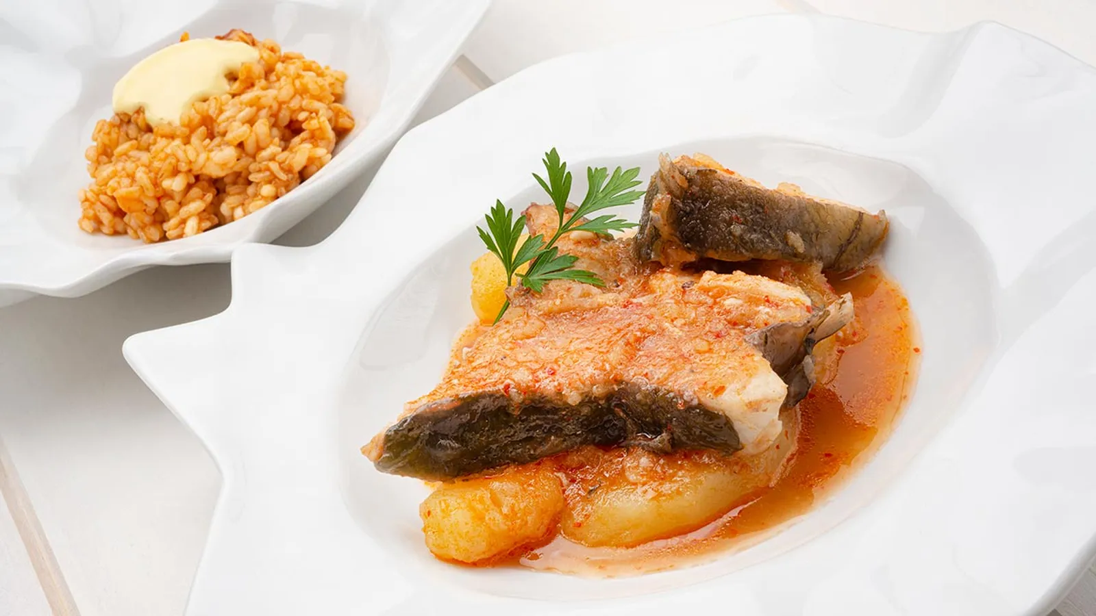 Reparte el pescado con patatas en 4 platos y adórnalos con unas hojas de perejil. Sirve el arroz en 4 platillos y acompáñalo con un poco de alioli.