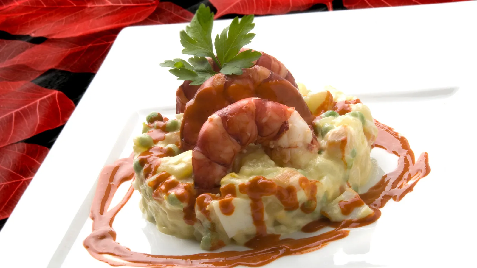 Carabineros con ensaladilla por Karlos Arguiñano. Una ensaladilla con patatas, huevos y guisantes acompañados de carabineros cocidos y una mahonesa con jugo de los carabineros.
