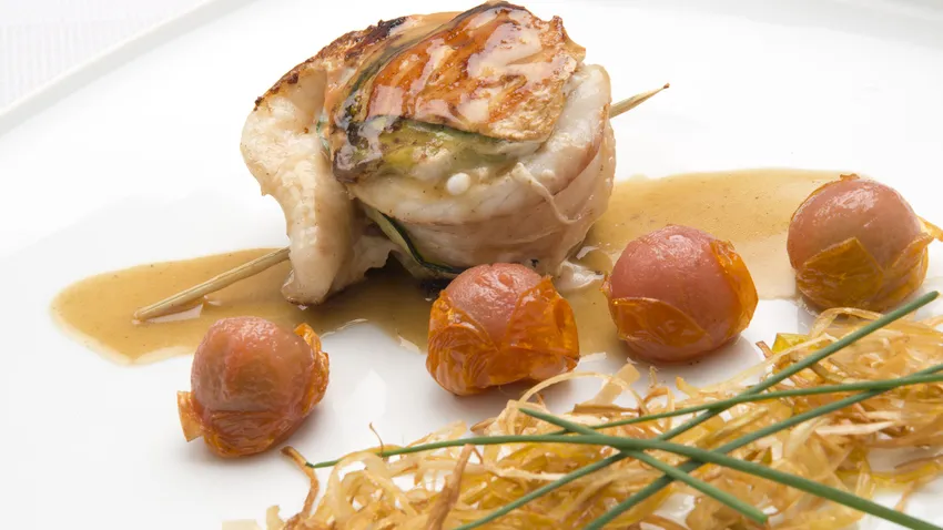 Eva Arguiñano prepara una receta de rollito de lenguado relleno de salmón y calabacín cocinado a la plancha con tomates cherry y puerro crujiente.