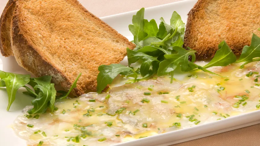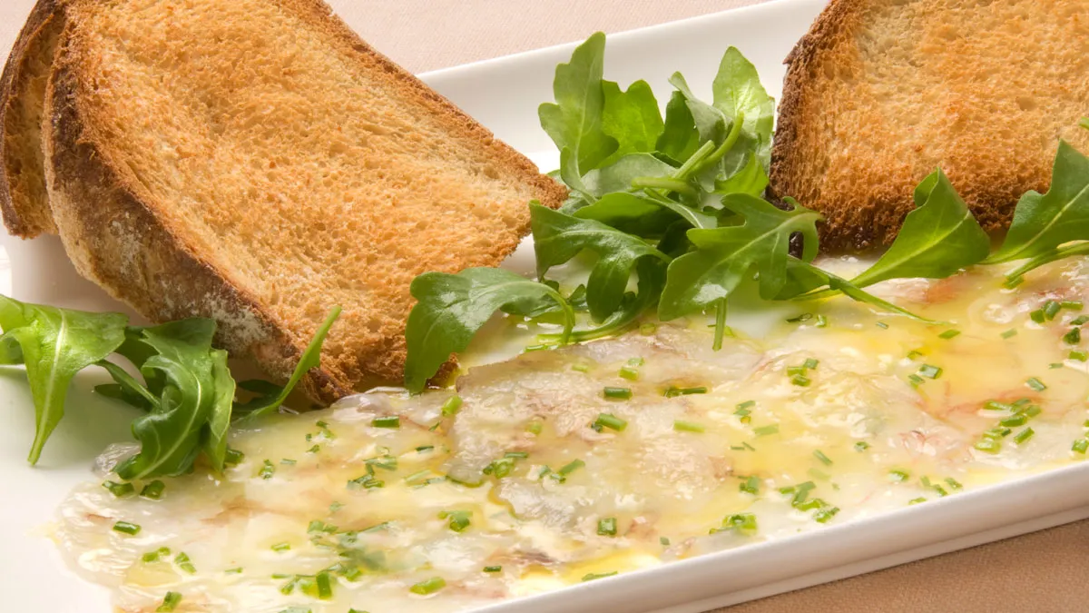 Carpaccio de langostinos, una receta elaborado por Karlos Arguiñano en la que se presenta la carne o pescado crudo y en finas láminas, aderezado con aceite de oliva y zumo de limón.