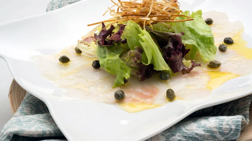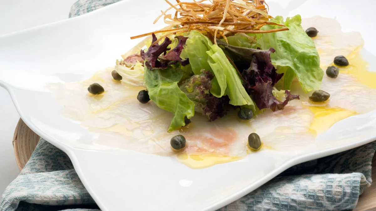 Receta de Karlos Arguiñano de carpaccio de rodaballo con lechuga, alcaparras y puerro crujiente, aliñado con vinagreta a la naranja, un plato especialmente recomendado para personas con colesterol alto.