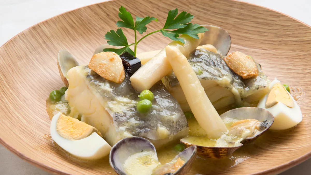 Receta de Karlos Arguiñano de cazuela de bacalao al pil-pil con espárragos, guisantes, almejas, huevos cocidos y refrito de ajos y guindillas, un plato con gran tradición en la cocina vasca.