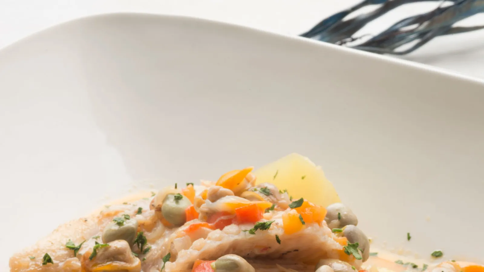 Salpimienta el pescado, corta cada aleta por la mitad y sella en una plancha con un chorrito de aceite. Agrégalos a la cazuela y cocínalos brevemente. Justo antes de apagar el fuego, añade los berberechos (sin cáscara) y mezcla suavemente. Espolvorea con perejil picado y sirve.