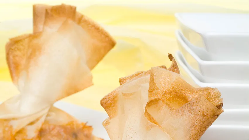 Reparte el relleno en las obleas de pasta brick, recoge la pasta a modo de paquetitos y átalos con un trozo de cuerda. Unta la bandeja del horno con un poco de aceite e introduce los 4 paquetitos. Hornea a 200º C durante 6-8 minutos (hasta que se dore la pasta).