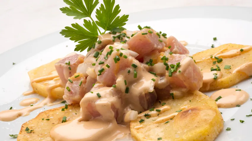 Receta de Karlos Arguiñano de ceviche de bonito acompañado de salsa rosa casera y patatas fritas.