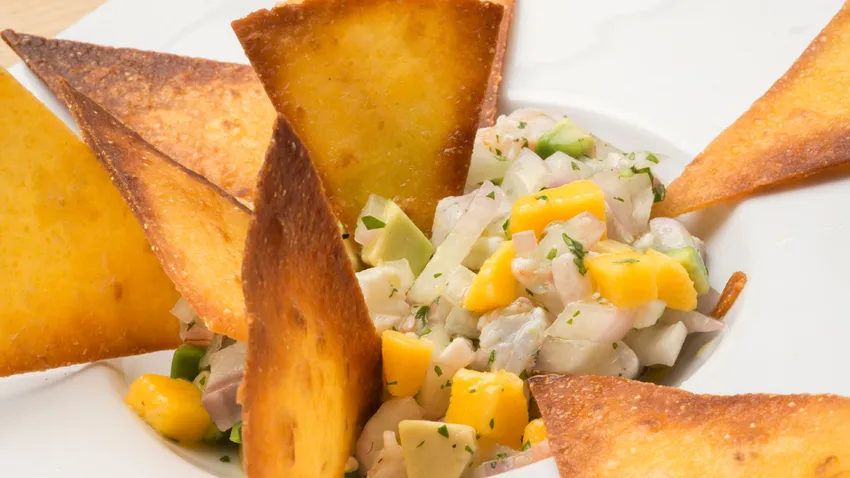 Receta de Karlos Arguiñano de ceviche de lubina, gambas, aguacate y mango acompañado de triángulos fritos.