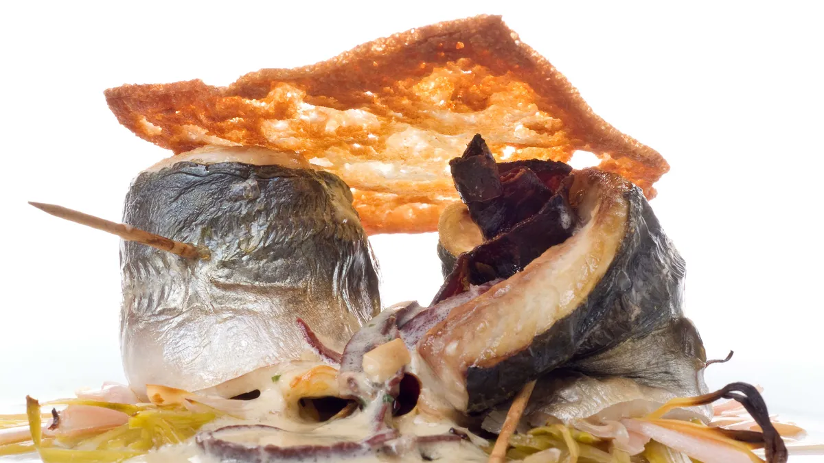 Coloca los filetes de chicharro con cecina en dos platos, acompaña con el puerro pochado y vierte la salsa por encima. Cubre con el queso crujiente y sirve.