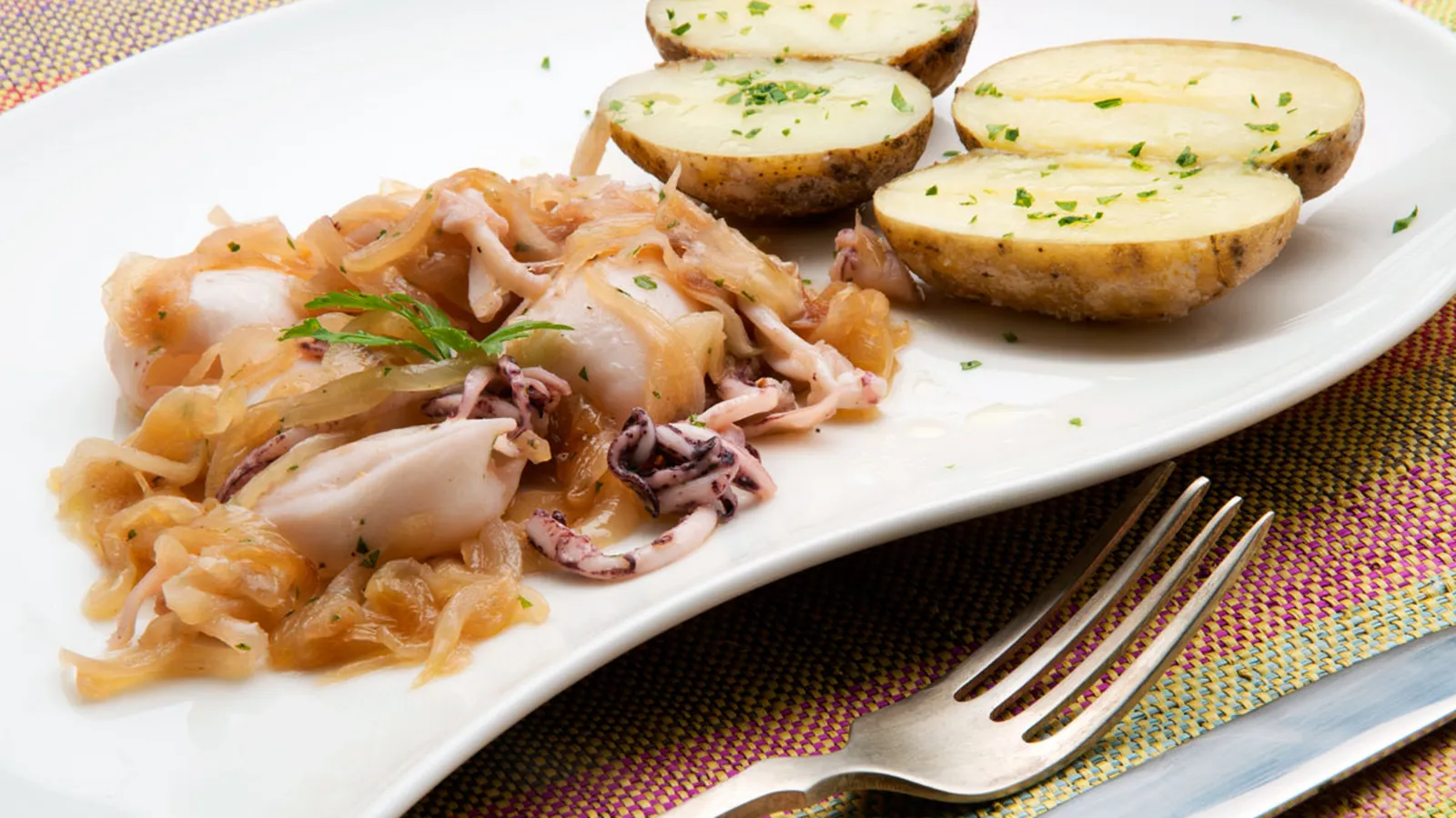 Sirve los chipirones a lo Pelayo y acompáñalos con las patatas y la cebolleta pochada.