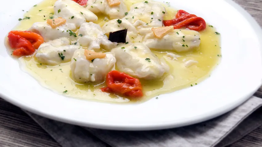 Espolvorea con perejil picado y sirve las cocochas al pil-pil con los pimientos morrones confitados.