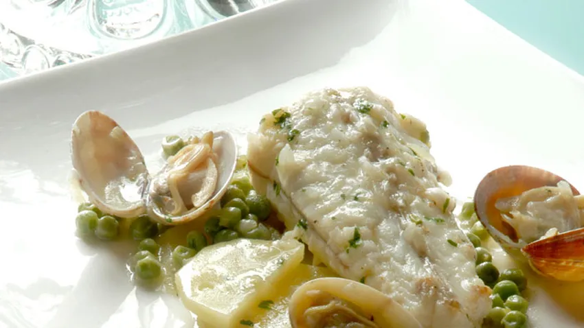 Receta de colas de rape cocinadas a la cazuela con patatas, almejas y guisantes.
