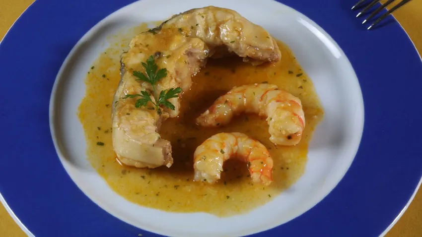 Receta de congrio en rodajas y guisado en cazuela con langostinos, verduras y cerveza.