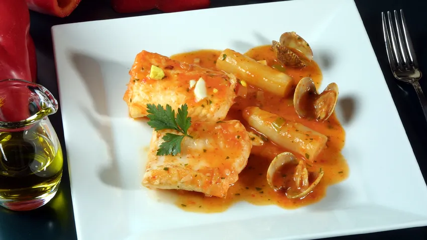 Receta de lomos de congrio guisados en salsa de pimiento morrón y acompañado de espárragos y almejas.