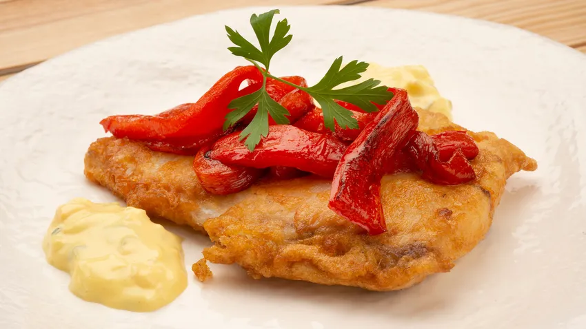 Corvina rebozada con salsa tártara y pimientos