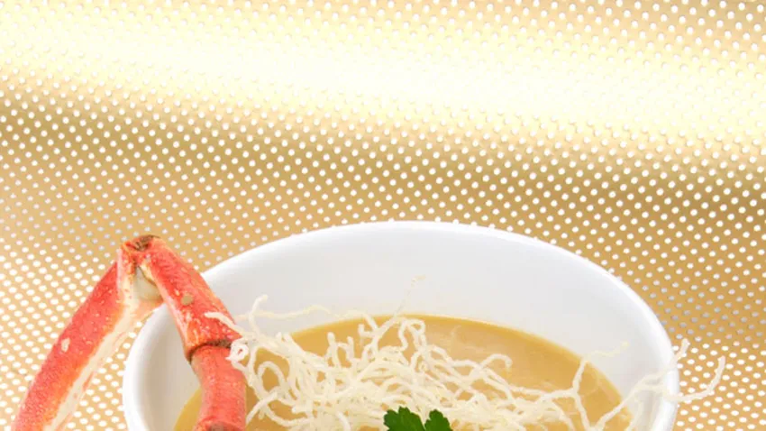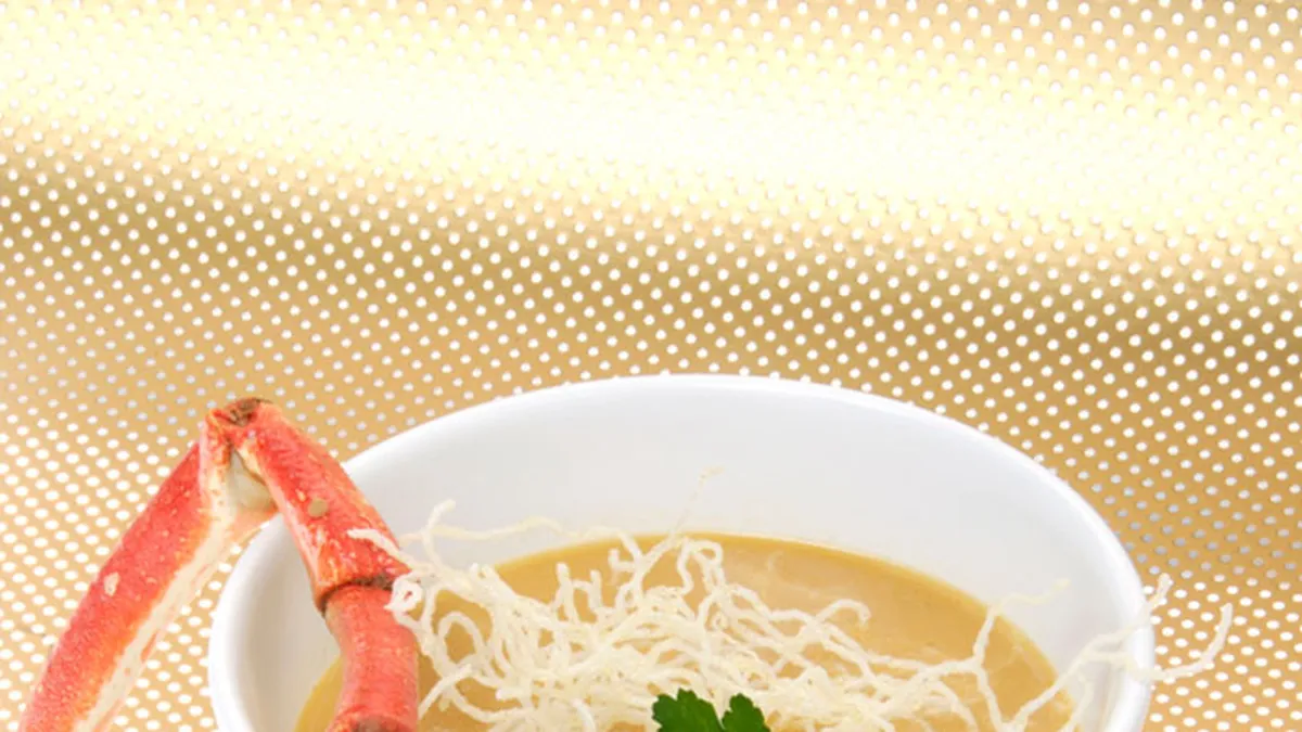 Deliciosa y suave receta de crema de centolla serivda con fideos fritos propuesta por Karlos Arguiñano.