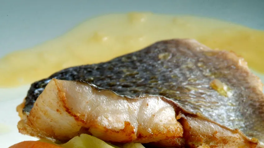 A la hora de emplatar, gotea la base del plato con la salsa, coloca encima el pescado y la espiral de verduras salteadas al lado.