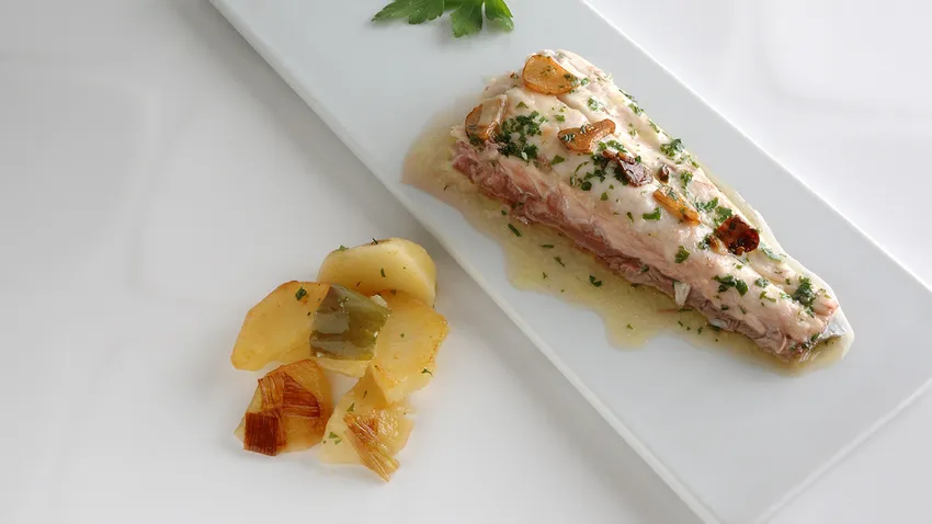 Pasa las patatas a la bandeja del horno, sazona los filetes de pescado y colócalos encima. Vierte el vino blanco e introduce en el horno a 180º C durante 12 minutos. Retira la bandeja del horno. Pica los otros 3 dientes de ajo en láminas finas y ponlas a dorar en una sartén con aceite. Antes de que se doren, agrega unas rodajas de guindilla y un poco de perejil picado, saltea brevemente y riega el pescado con el sofrito.