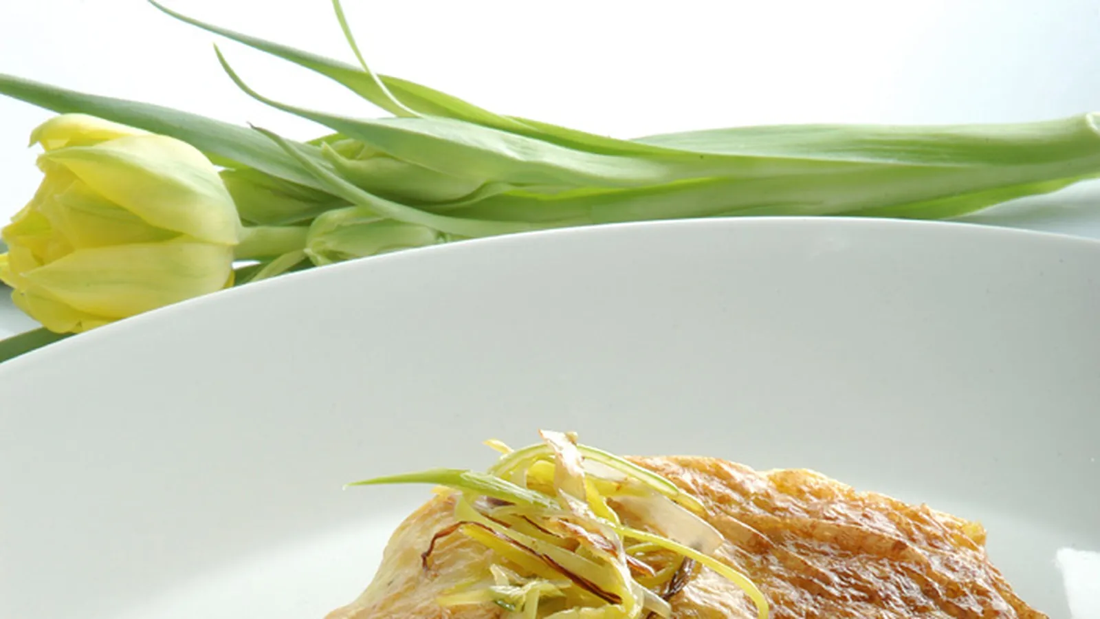 Plato de pescado a base de dorada asada al horno con puerros salteados y acompañado de una salsa a base de mantequilla, huevo y zumo de limón.