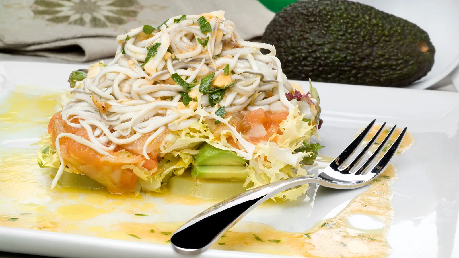 Receta de ensalada caliente de gulas del cocinero Ramón Roteta, una rica combinación de patata, aguacate, tomates, lechugas variadas y gulas cocidas con albariño.