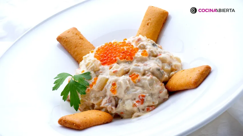Arguiñano prepara esta ensaladilla con carne desmigada de buey de mar, patatas, zanahorias y huevos cocidos, además de alcaparras, pepinillos y huevas de trucha, todo mezclado con mahonesa o mayonesa casera.