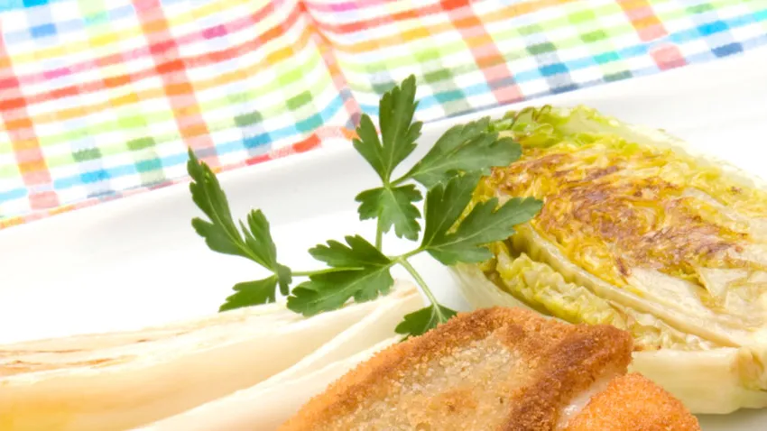 Corta las endibias y los cogollos de Tudela por la mitad a lo largo. Cocínalos a la plancha con una gotita de aceite y una pizca de sal.