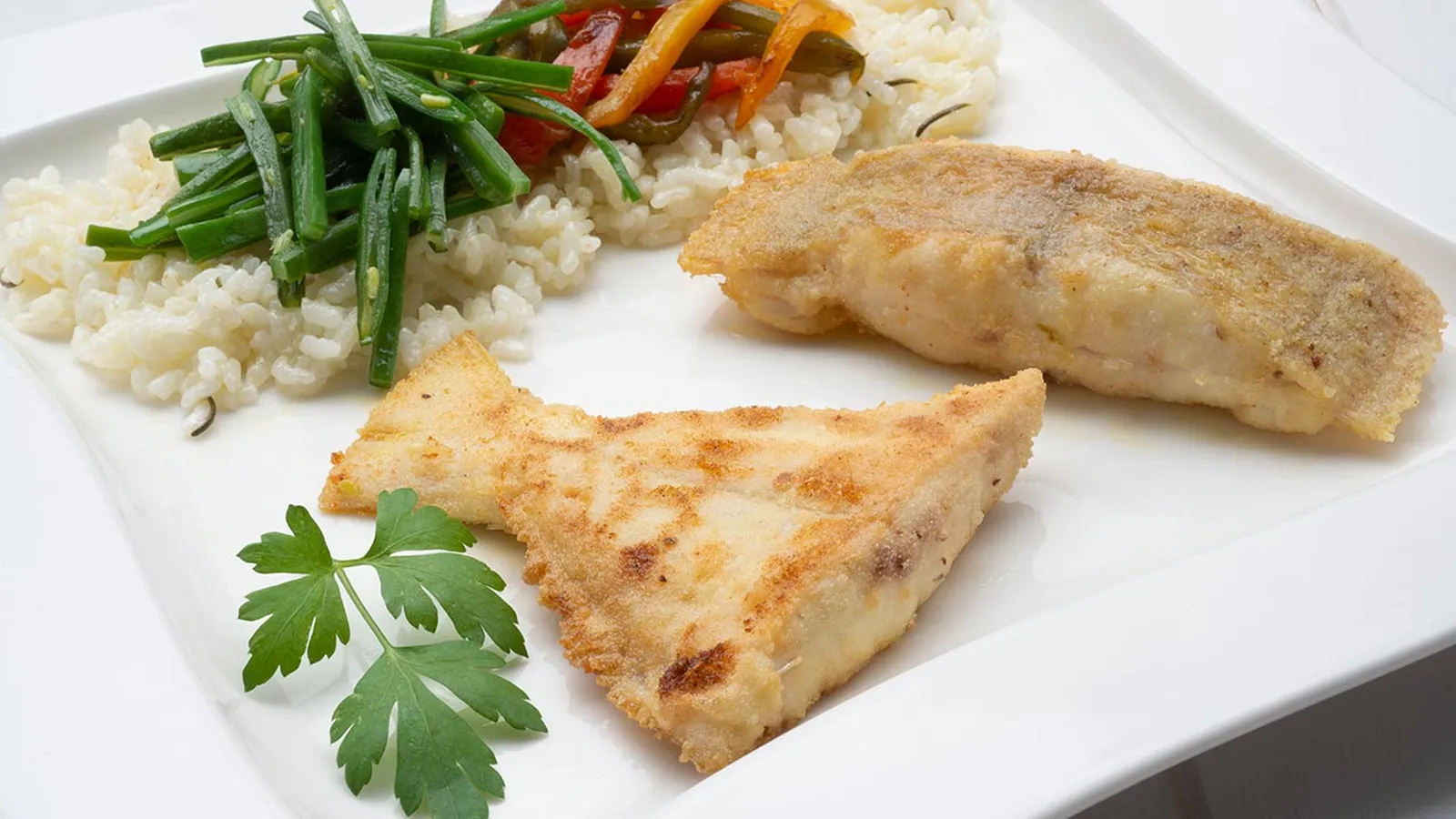 Gallo frito con judías verdes y arroz con pimientos
