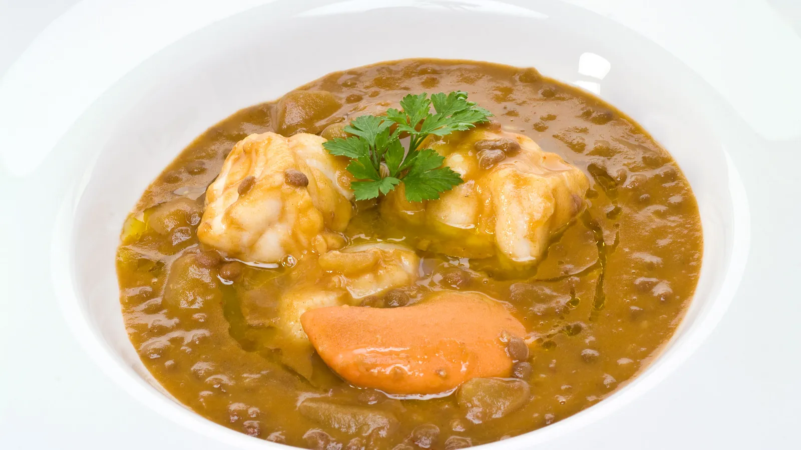 Deliciosa y sencilla receta de guiso marinero de lentejas, un cocido realizado con legumbres, rape, vieiras, patatas y zanahoria. Receta de Bruno Oteiza.