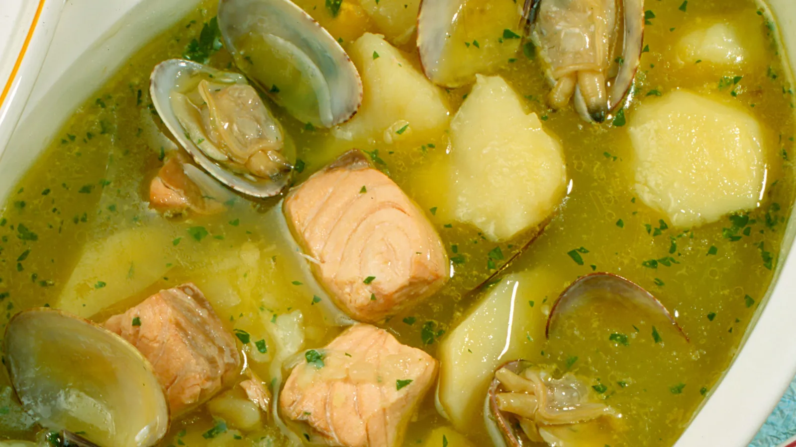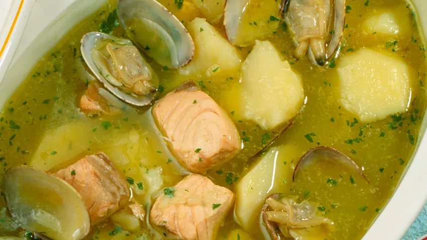 Cuando la patata lleva cociendo 20 minutos se añaden las almejas y el salmón cortado en dados. Dejamos cocer 10 minutos y servir.