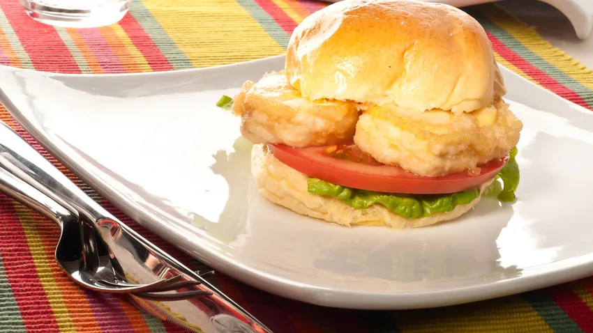 Una receta de hamburguesa de pescado, en este caso merluza rebozada, con tomate y lechuga en pan de hamburguesa. Una receta perfecta para que los niños coman pescado.