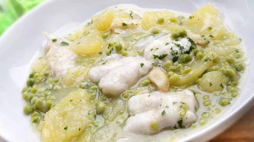 Kokotxas de bacalao con guisantes y patatas