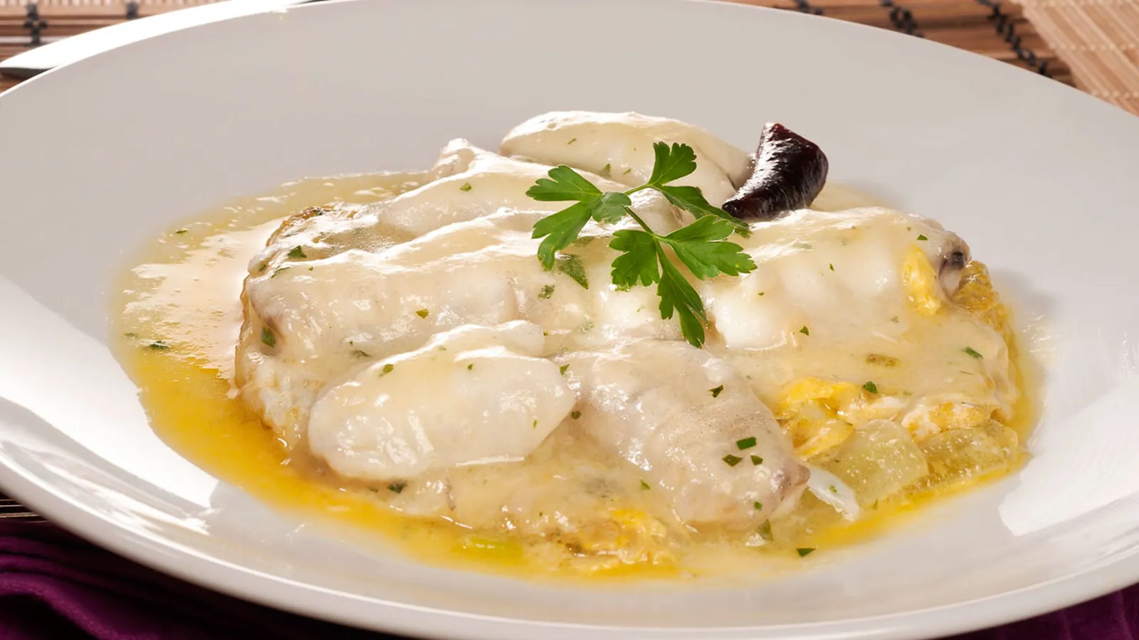 Kokotxas al pil-pil sobre tortillas de borrajas