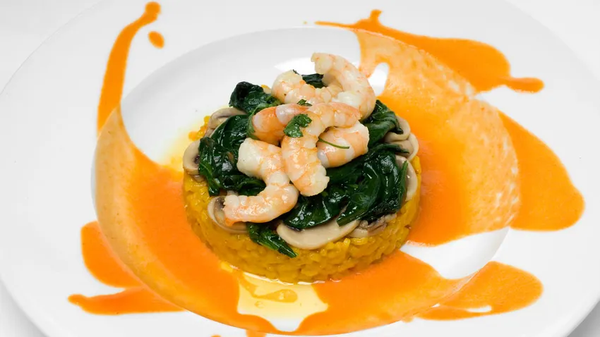 Receta de langostinos salteados con arroz aromatizado con azafrán y champiñones y espinacas para acompañar.