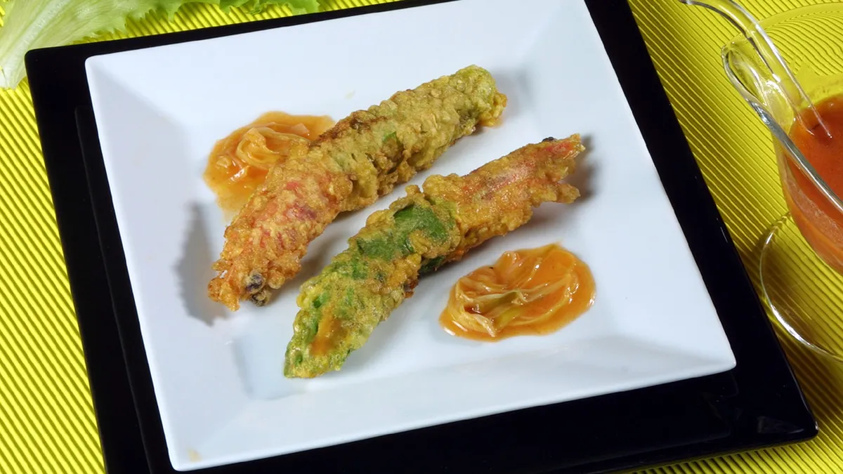 Receta de langostinos envueltos en lechuga y rebozados acompañados de una salsa de tomate y puerros picante