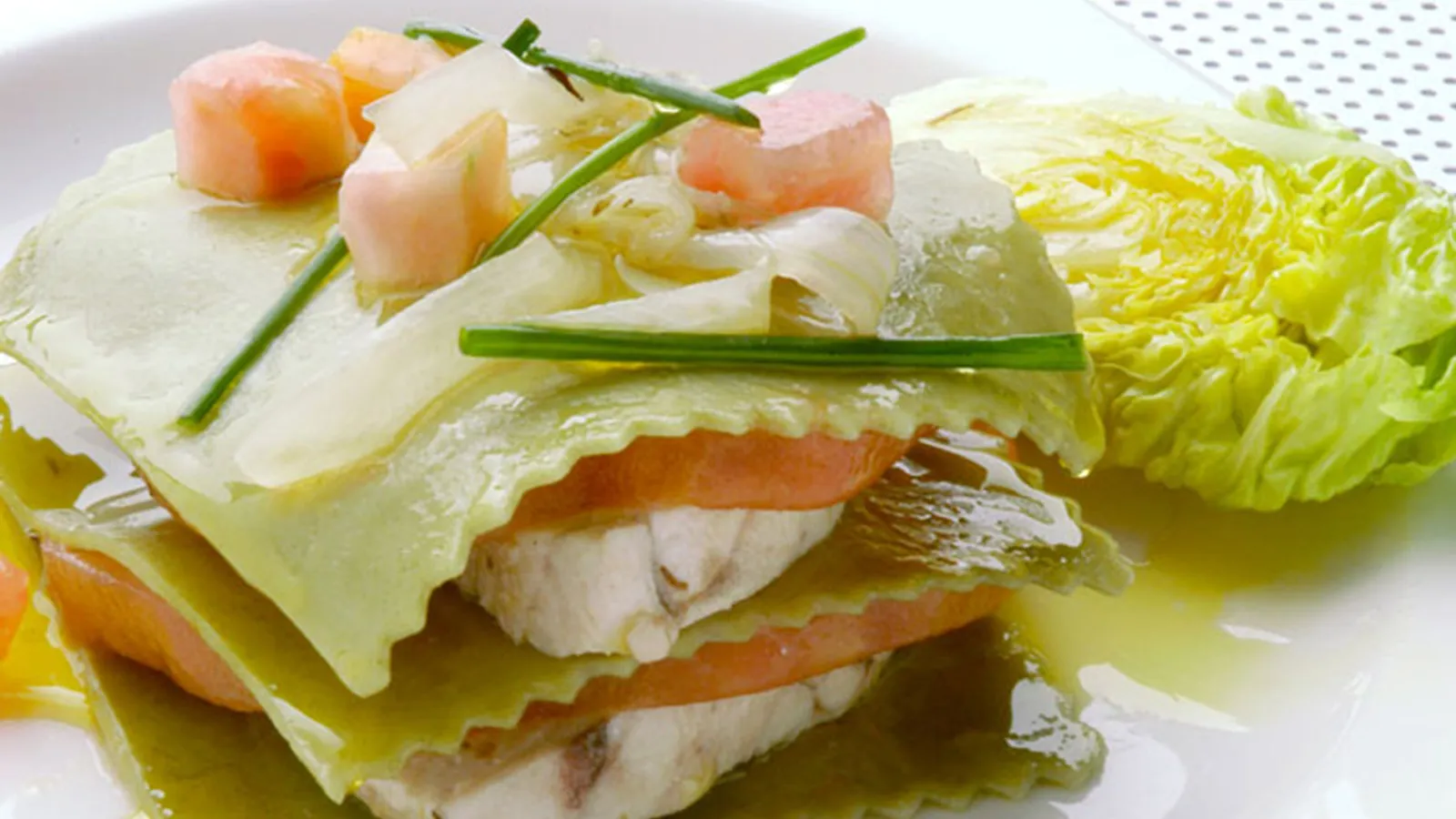 Pon agua a cocer en una cazuela grande, sazona y echa un chorrito de aceite. Cuando empiece a hervir, agrega las láminas de lasaña. Deja cocer según instrucciones del fabricante. Retíralas de la cazuela, refréscalas y córtalas por la mitad. Monta el plato, alternando capas de lasaña con el bonito escabechado y las rodajas de tomate. Añade unos dados de tomate, riega con un poco del escabeche y acompaña cada ración con un cogollo cortado en cuatro. Decora con unas ramas de cebollino.