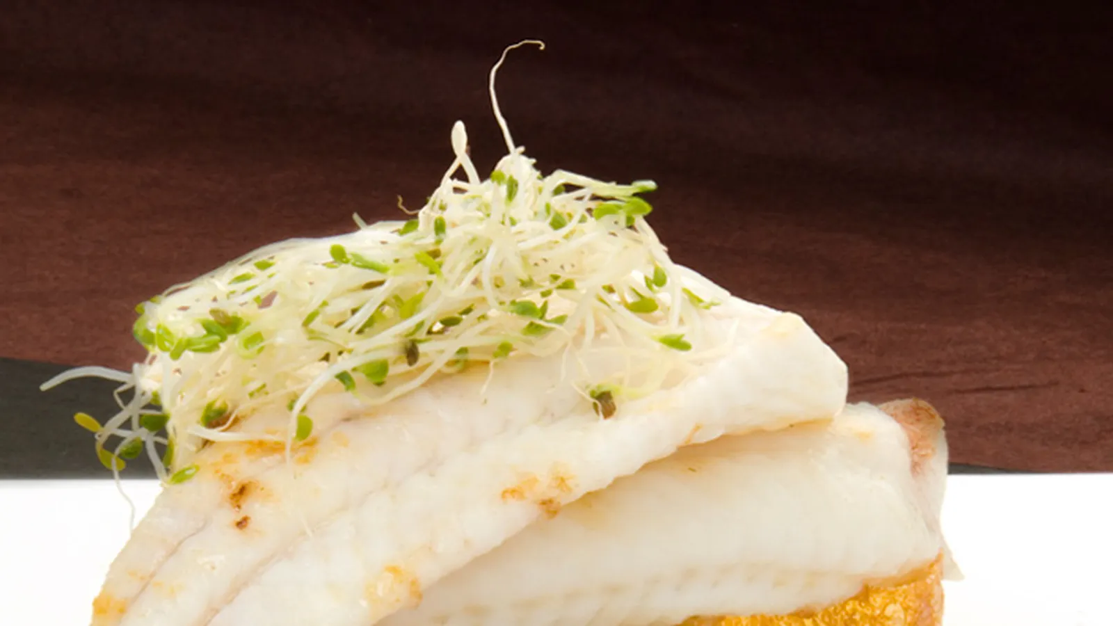 Sirve en un plato una tira de piel crujiente y coloca encima dos filetes de lenguado. Acompaña con la salsa y con los germinados de alfalfa aliñados con vinagre, aceite y sal.