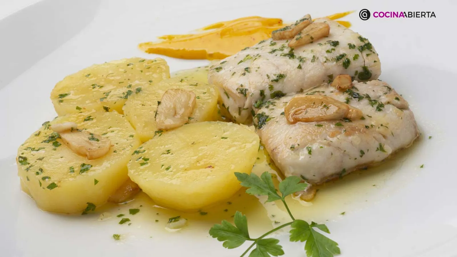 Sirve una patata y un lomo de pescado en cada plato, y salséalos con el refrito. Sirve también un poco de alioli y adorna los platos con unas hojas de perejil.