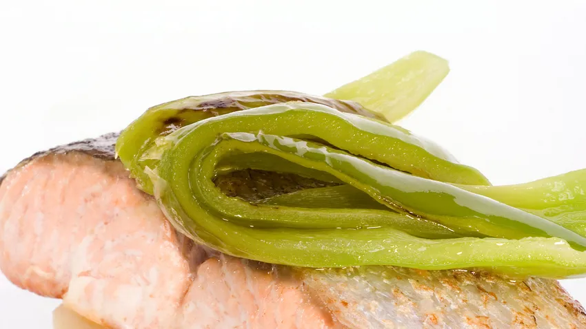 Receta del programa Cocina para 2: Lomo de salmón a la marinera con patatas, pimiento verde y cebolleta del cocinero Ramón Roteta