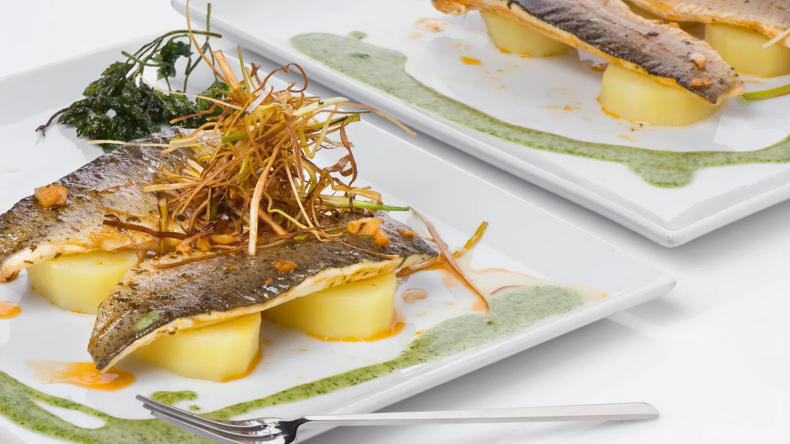 Coloca encima de cada rodaja de patata el lomo de trucha, el puerro y el perejil frito. Moja con la salsa de espinacas.