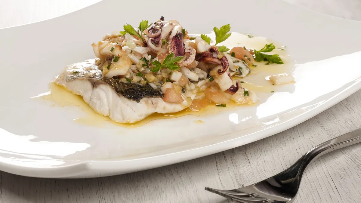 Bruno Oteiza presenta una receta de lubina al horno acompañada de vinagreta de calamar, aceitunas y tomate, un plato muy saludable.