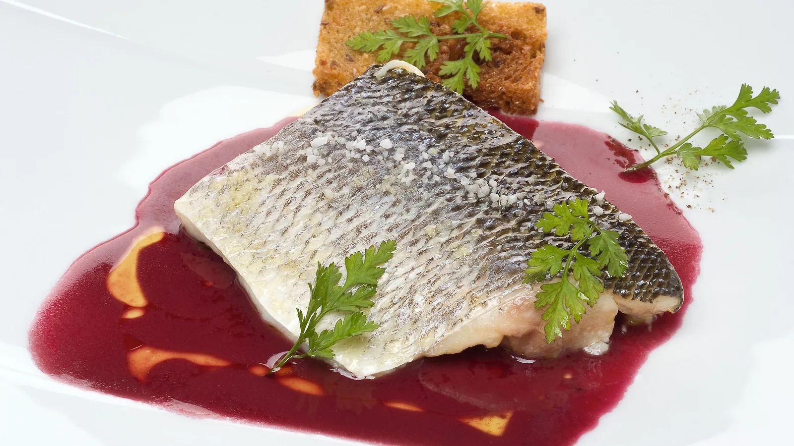 Receta de lubina confitada a baja temperatura con salsa de vino tinto y rebanadas de pan frito.
