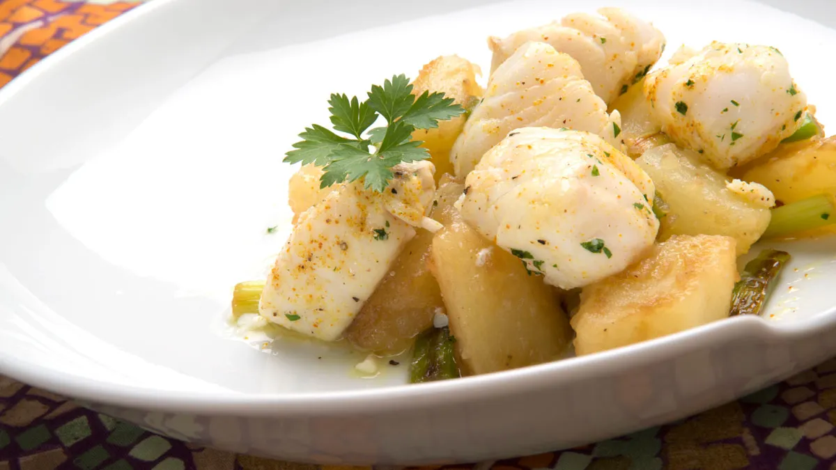 Receta de Karlos Arguiñano de mediana salteada al curry acompañada de dados de patata y ajos frescos, todo cocinado en el wok.