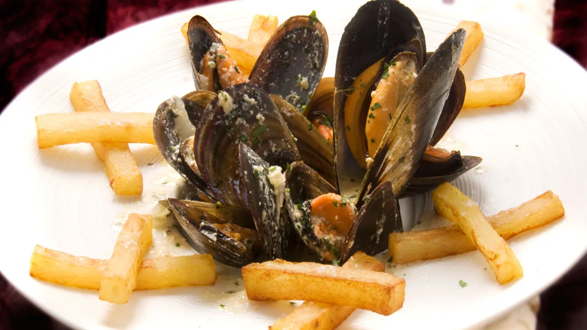 Mejillones al estilo de Bruselas con patatas fritas