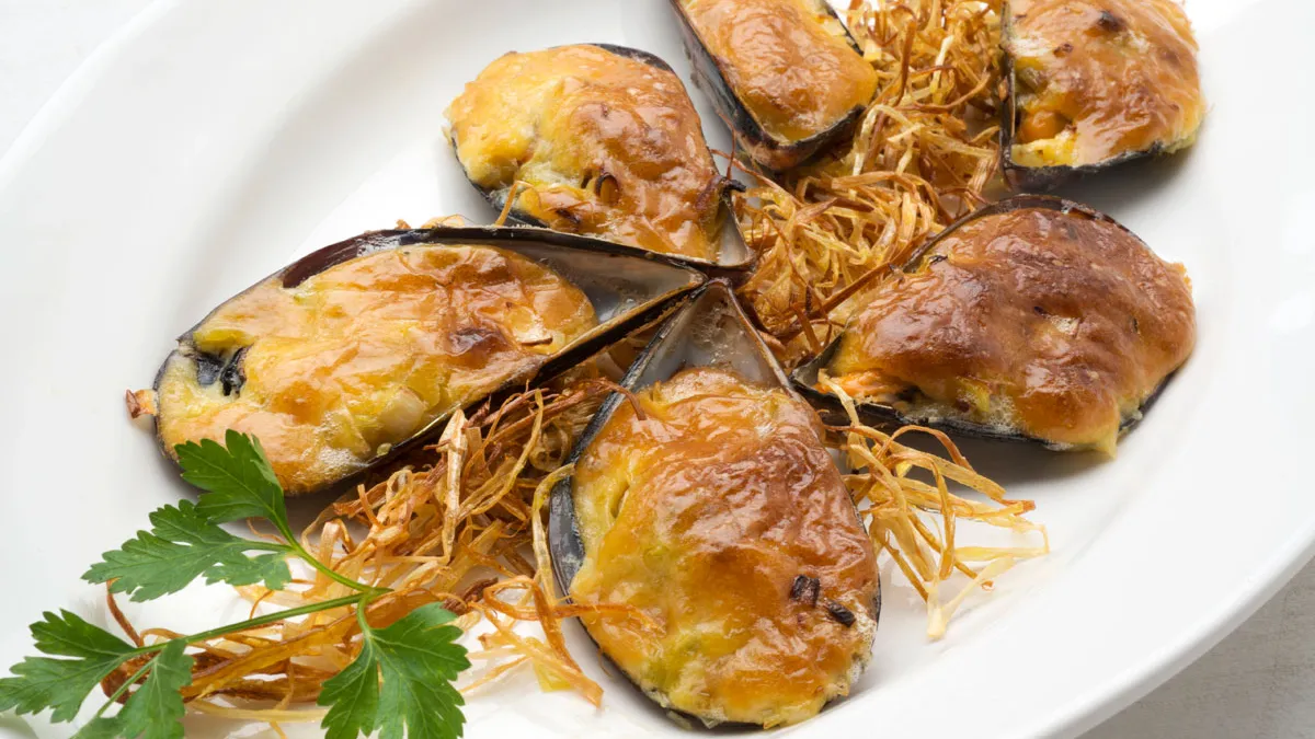 Receta de Karlos Arguiñano de mejillones cocidos y gratinados en el horno con una salsa holandesa y acompañados de tiras de puerro frito.