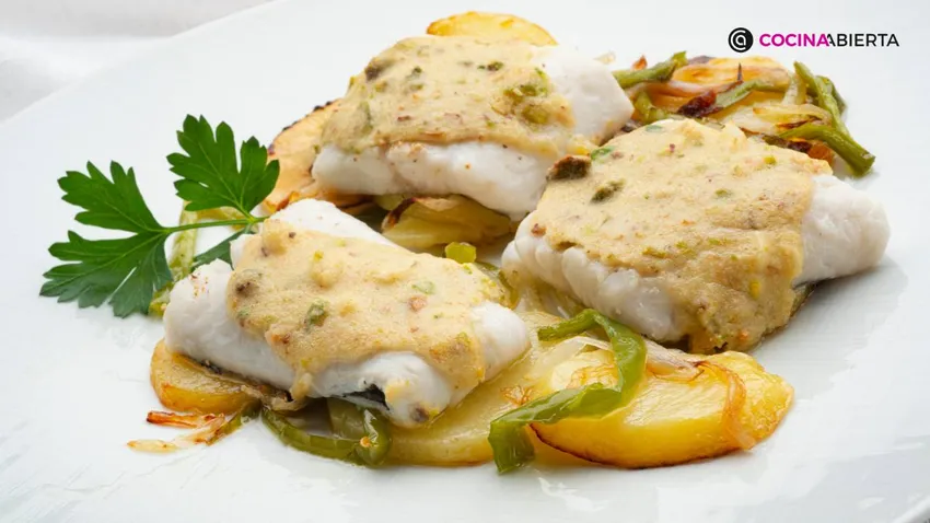 Este plato es el clásico pescado al horno que siempre triunfa en cualquier hogar, acompañado de las infaltables patatas panaderas, una guarnición que nunca falla en las recetas caseras. El detalle especial en esta versión es la capa crujiente de pistachos, que le da un toque único al plato.