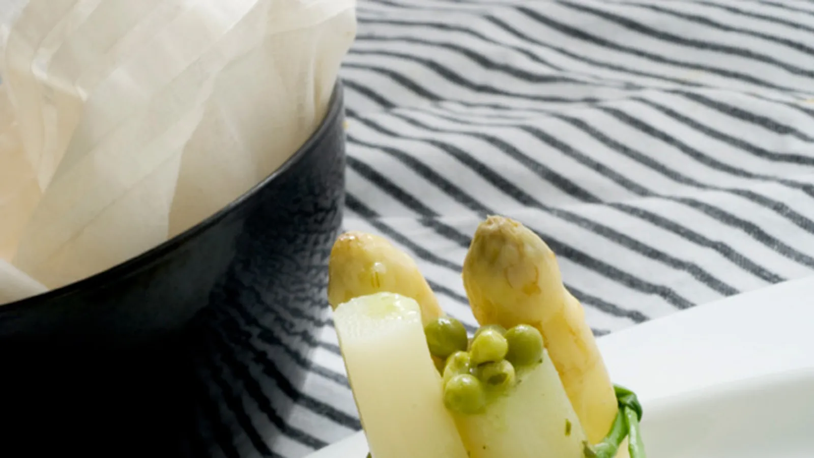 Pela los espárragos y ponlos a cocer en una cazuela con abundante agua. Añade un poco de azúcar y de sal. Deja cocer 10-12 minutos. Escurre y reserva el caldo de la cocción. Corta cada espárrago en 2 trozos y átalos, de 4 en 4 trozos, con una tira de cebollino. Reserva.