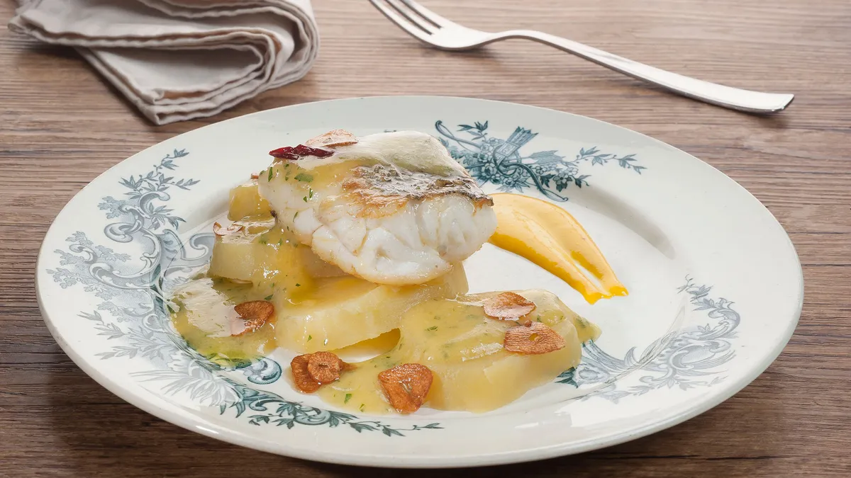 Salar la merluza y asarla en una sartén antiadherente 6 minutos del lado de la carne, darle la vuelta con cuidado y seguir asándola otros 8 minutos del lado de la piel. Cuando haya pasado el tiempo colocar la merluza sobre las patatas cocidas, calentar el refrito de aceite, ajos y cayena, y cuando el ajo comienza a bailar y se ponga anaranjado, volcarlo sobre la de merluza. En la misma sartén añadir el vinagre de sidra y volcarlo sobre la merluza. Recuperar el refrito en la misma sartén y volver a hacer la misma operación otras 2 veces más. Espolvorear con perejil picado.