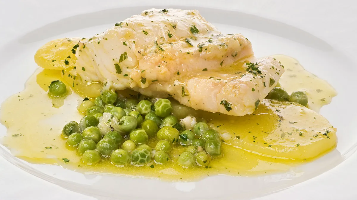 Receta de lomos de merluza en salsa de vino blanco con guisantes, patatas y cebolla.